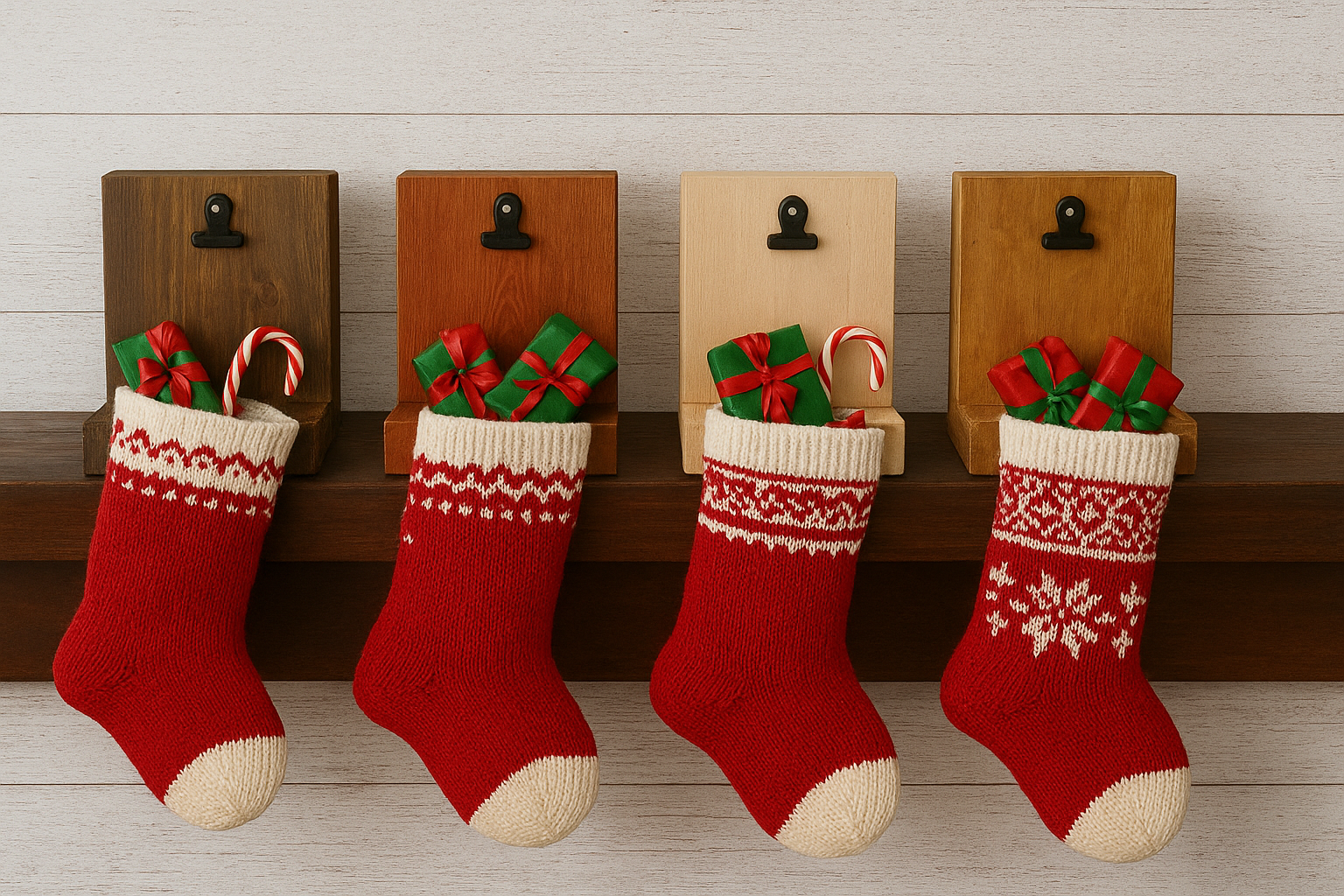 Hang your stockings by the chimney with care and not mess up your mantle with these simple yet heavy duty stocking holders. Don't have a fireplace, put these up wherever you want to hold your stockings. Each piece is made from solid wood and finished in a variety of natural tones, featuring a sturdy metal hook for hanging stockings and a clip perfect for holding a photo, tag, or holiday card. These stocking holders combine function with farmhouse style, adding warmth and craftsmanship to your mantel or shelf all season long.