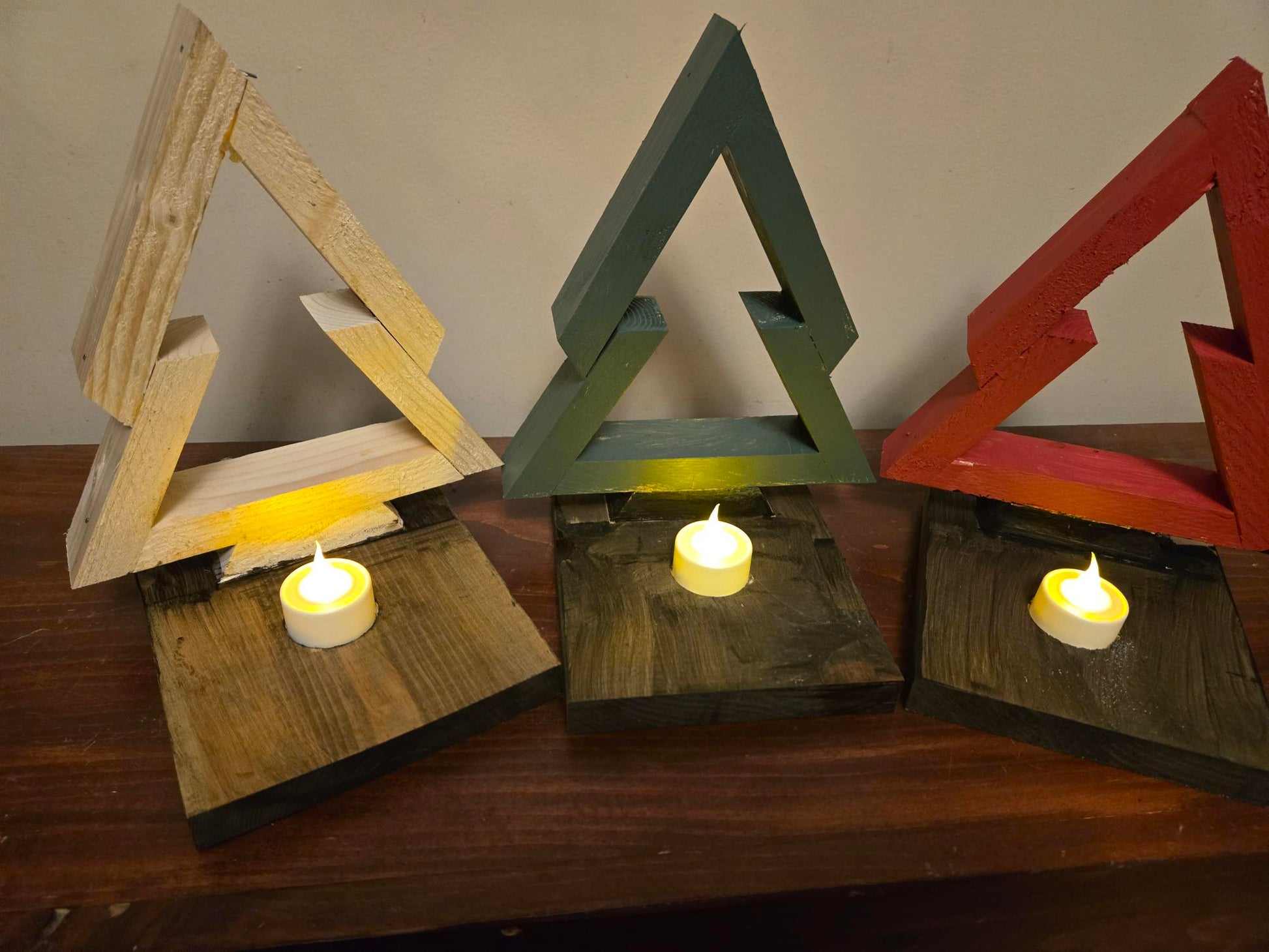 Based on the classic Christmas tree trio, now featuring a base with a tea light, which brings a warm, rustic glow to your home. Each tree is made from solid wood, cut and painted by hand, and paired with a soft flickering tea candle for a cozy holiday ambiance. Perfect for mantels, shelves, or table centerpieces, these unique pieces capture the charm of handcrafted craftsmanship and the spirit of the season.